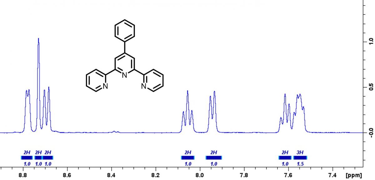 Students in the ACC Chemistry Research Scholars group traveled to CU Denver to perform 1H NMR (nuclear magnetic resonance) spectroscopy experiments on compounds they synthesized. NMR spectroscopy is a powerful technique that is used to determine the structure of molecules. When a molecule is placed in a strong magnetic field, odd numbered nuclei within the molecule will begin to behave like miniature magnets due to the nuclei’s intrinsic spin character. Pulsing radio waves are then used to probe the strength of each ‘mini-magnet’ nuclei within the molecule. When the exact radio wave frequency is found the nucleus will begin to resonate, similar to tuning a musical instrument. The principles of NMR are very similar to that of an MRI used in medical imaging. In an MRI, the hydrogen atoms in water molecules are probed. Since you have water in almost all of your body tissue, MRI can used to allow doctors to see environments around muscles, blood vessels, nerves, lymph nodes, and even bones. Similarly, chemists can use NMR to probe the exact chemical environment around hydrogen atoms in complex molecules, allowing them to elucidate the molecular structure. Shown below is a 1H NMR spectrum of a compound made by students in the Chemistry Research Scholars group. Special thanks to Dr. Scott Reed at CU Denver for assisting us with running the 1H NMR experiments.